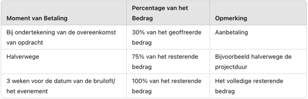 8.1 Betalingsschema: Betalingen dienen te worden voldaan volgens het volgende schema: